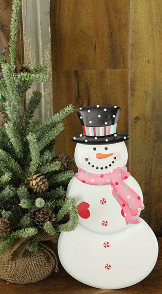 MD0725 12"H X 6.5"L Pink Embossed Snowman W/Scarf White/Pink/Red/Black