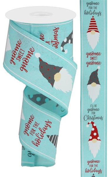 Use this jolly Christmas gnome heads/royal burlap ribbon in your next holiday display! This sewn wired edge ribbon includes a family of festive gnomes against an ice blue base, making them excellent representations of holiday spirit! Use this ribbon in a wreath display, or wrap it around the Christmas tree!