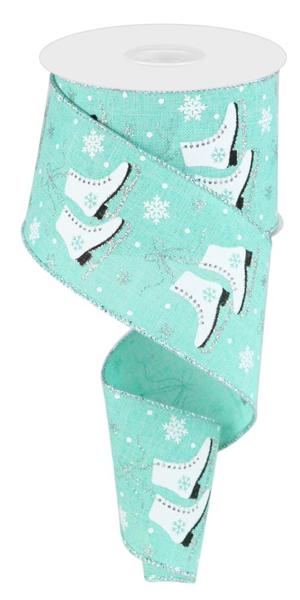 Celebrate the skater and the designer in your home when you use this stylish ice skates/royal burlap ribbon! Featuring a metallic silver wired edge, plus a flurry of snowflakes and ice skates against a dark mint base, this ribbon will be a perfect addition to any display you see fit! Use this ribbon in a wreath display, on the Christmas tree, or in a string of decorated garland!
