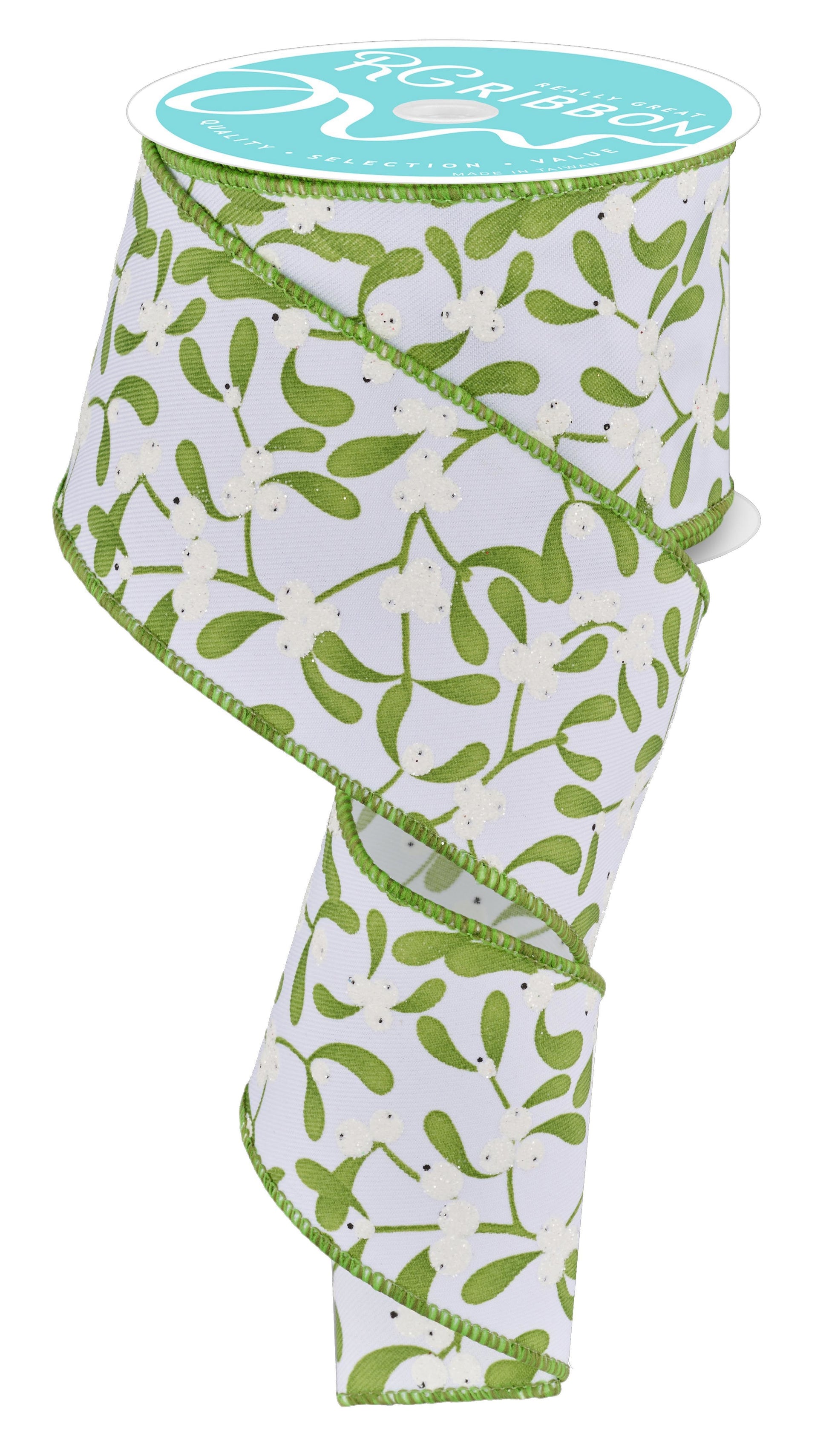 Add festive greenery and elegant charm to your holiday designs with this 2.5" x 10yd Mistletoe Ribbon in White with Multi Green accents. Featuring beautifully illustrated mistletoe sprigs and berries, this ribbon brings a fresh, natural look to wreaths, bows, tree decorating, gift wrapping, garlands, and Christmas craft projects.