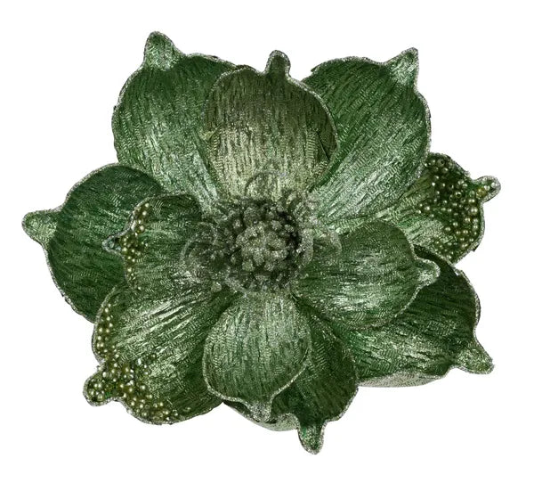 Add fresh elegance and soft shimmer to your décor with this Metallic/Glitter Magnolia! Featuring layered mint-green petals with metallic detailing and a sparkling glitter finish, this clip-on bloom brings gentle color, texture, and refined shine to wreaths, trees, garlands, centerpieces, and seasonal arrangements.